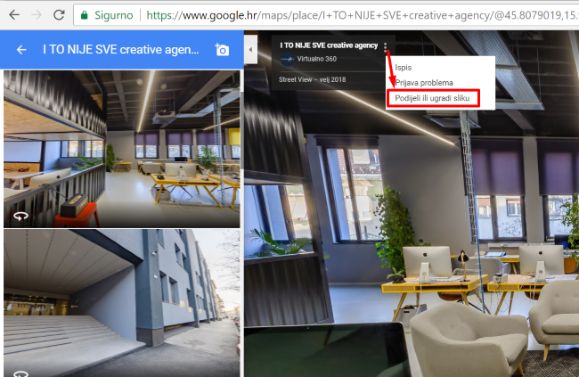 Kliknite na ikonu sa tri točke koja se nalazi u gornjem lijevom kutu i iz otvorenog prozora odaberite “Podijeli ili ugradi sliku” ili “Share or embed image”.