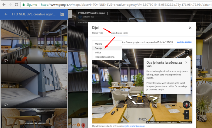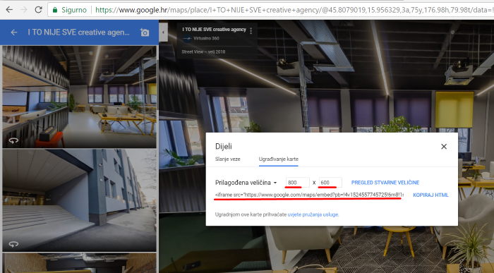 Ako je potrebno da veličina okvira vaše virtualne šetnje bude određene veličine kako bi odgovarao određenom prostoru na stranici, nema problema. Nakon odabira “Custom size” ili “Prilagođena veličina”, možete odabrati dimenzije po želji. Unesite dimenzije, zatim označite kod i kopirajte ga.